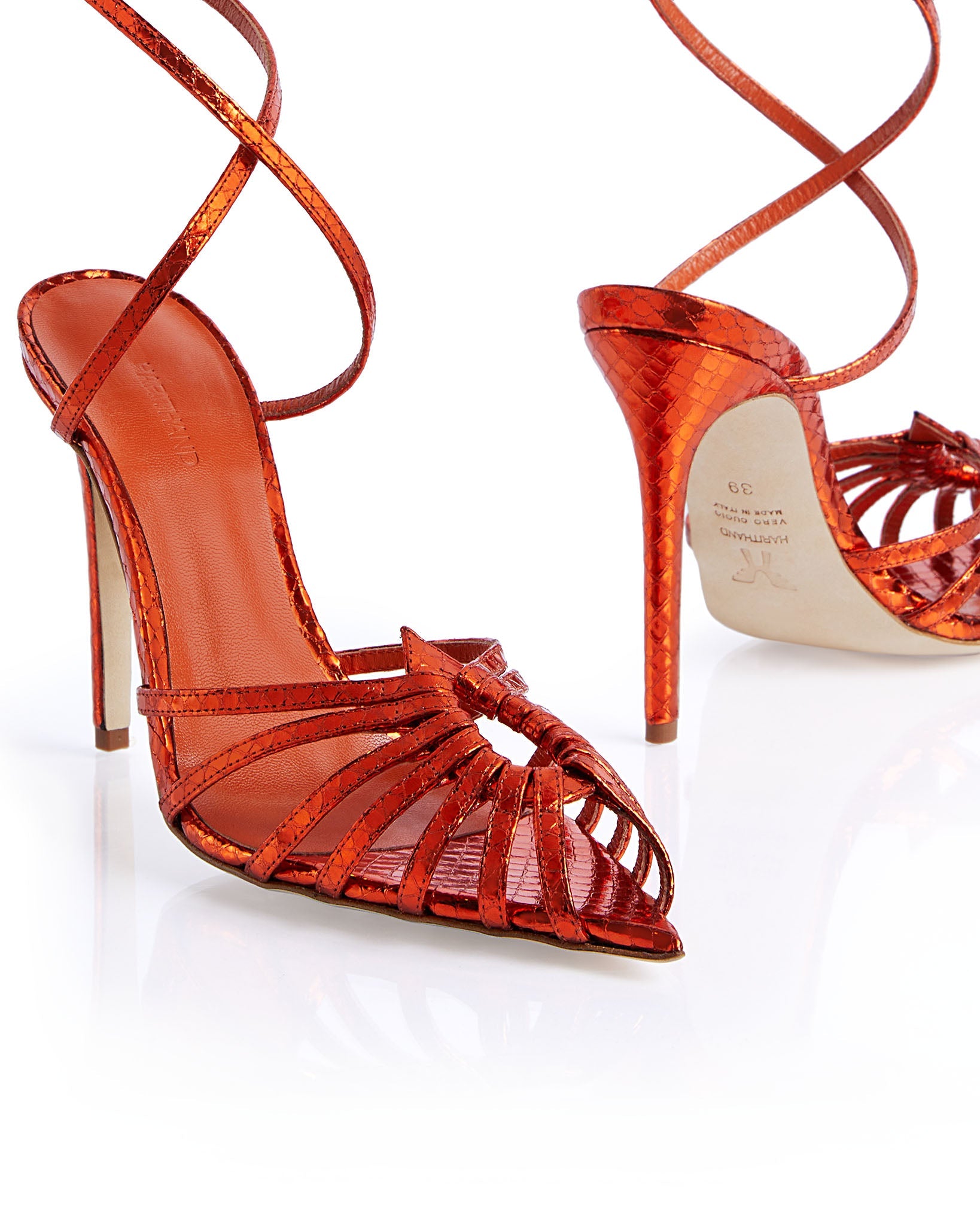 Part of Harithand's first shoe collection, Boy Tear Python Sandal Heels are masterfully handcrafted in Italy with genuine cow leather insoles. They have slim straps that wrap around the ankle and a cage-like silhouette set on a pointed toe.