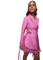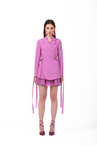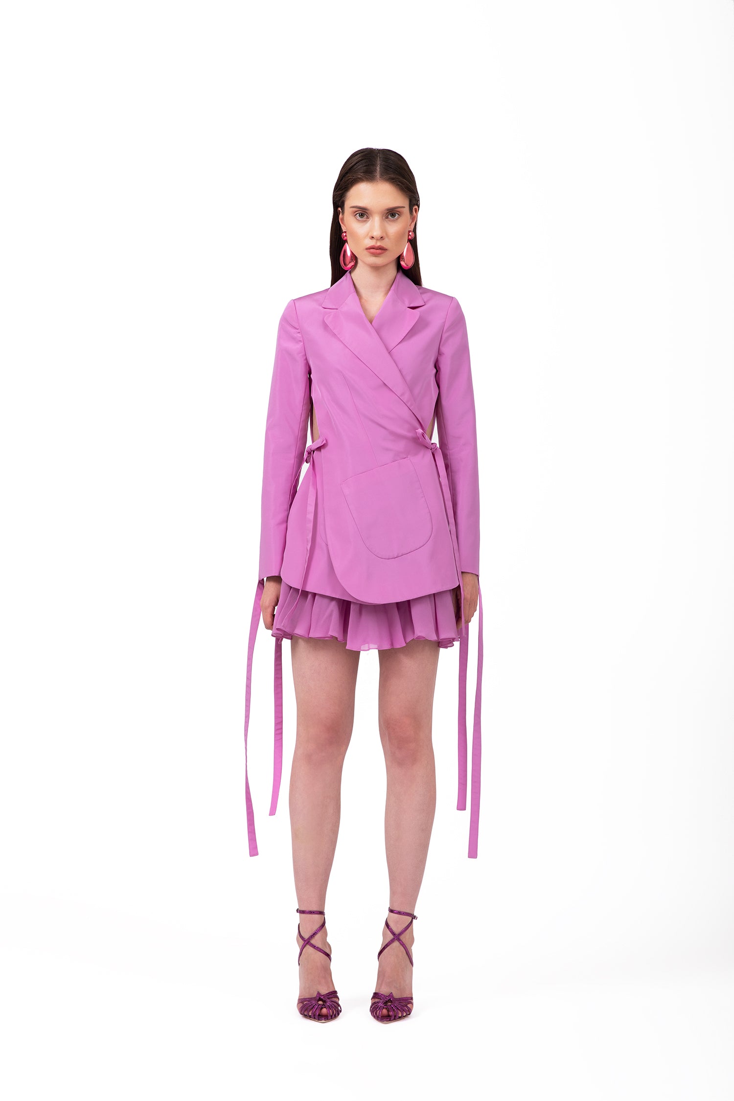 Infused with feminine style codes, Haily is a distinctive silhouette. This skirt suit set features a wrap-style tafetta faille blazer with side slits that bare the side waist, held together in place by knotted ties.