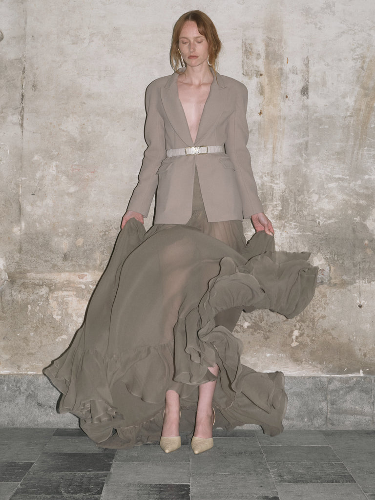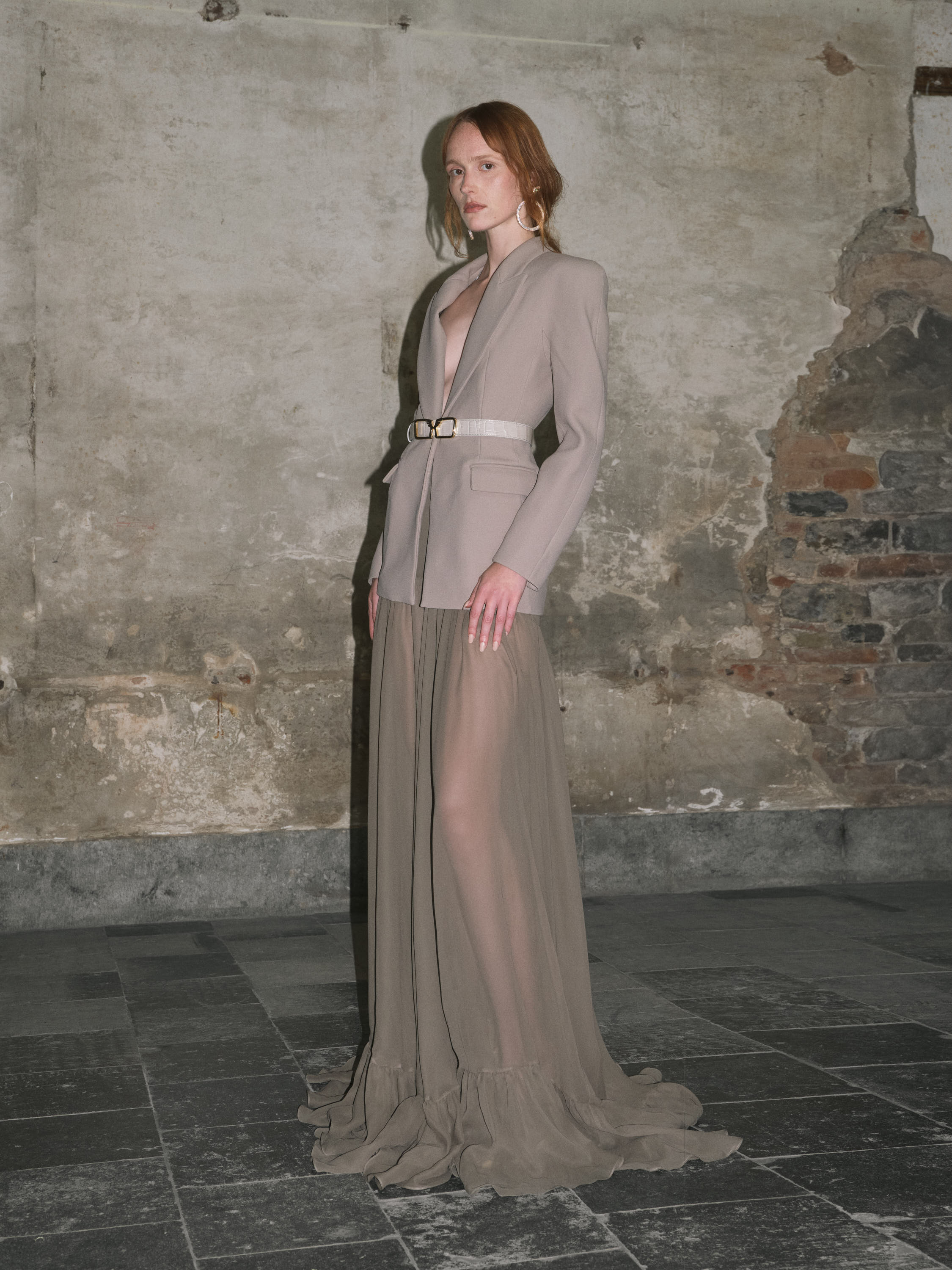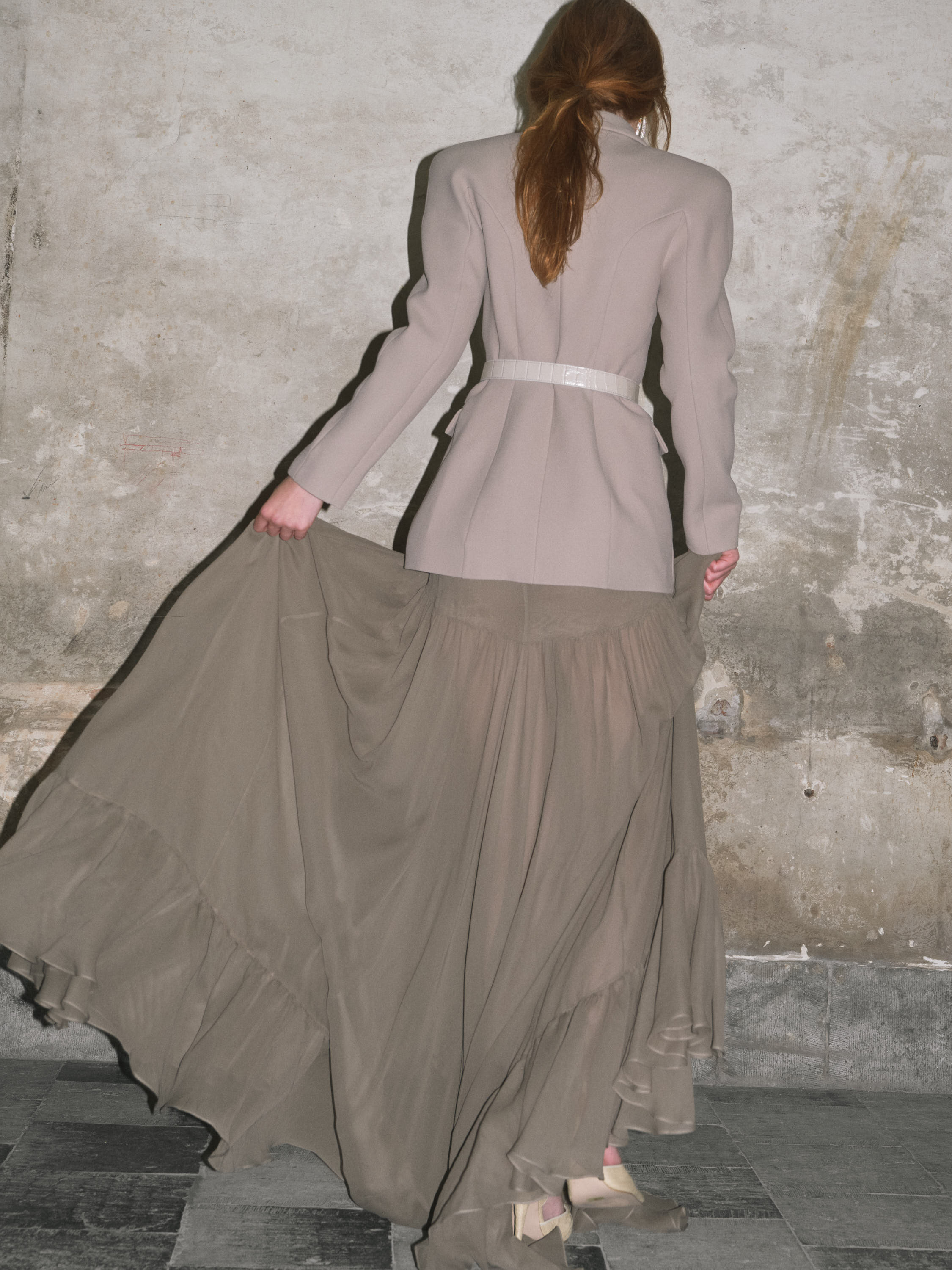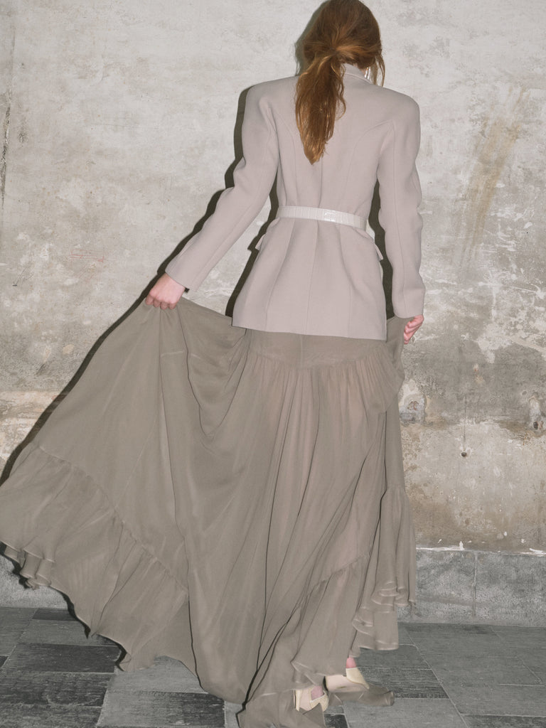 Regina straddles worlds with grace and strength, her presence drawn in the cut of a single-breasted blazer and the sweep of a floor-length skirt. The blazer, in double crepe, sharpens the silhouette with structured shoulders and a low-break peak lapel, fastening at the waist. Its counterpart, a silk georgette skirt, is gathered into tiers that fall to a flounce hem and train, tempering command with fluid movement.
