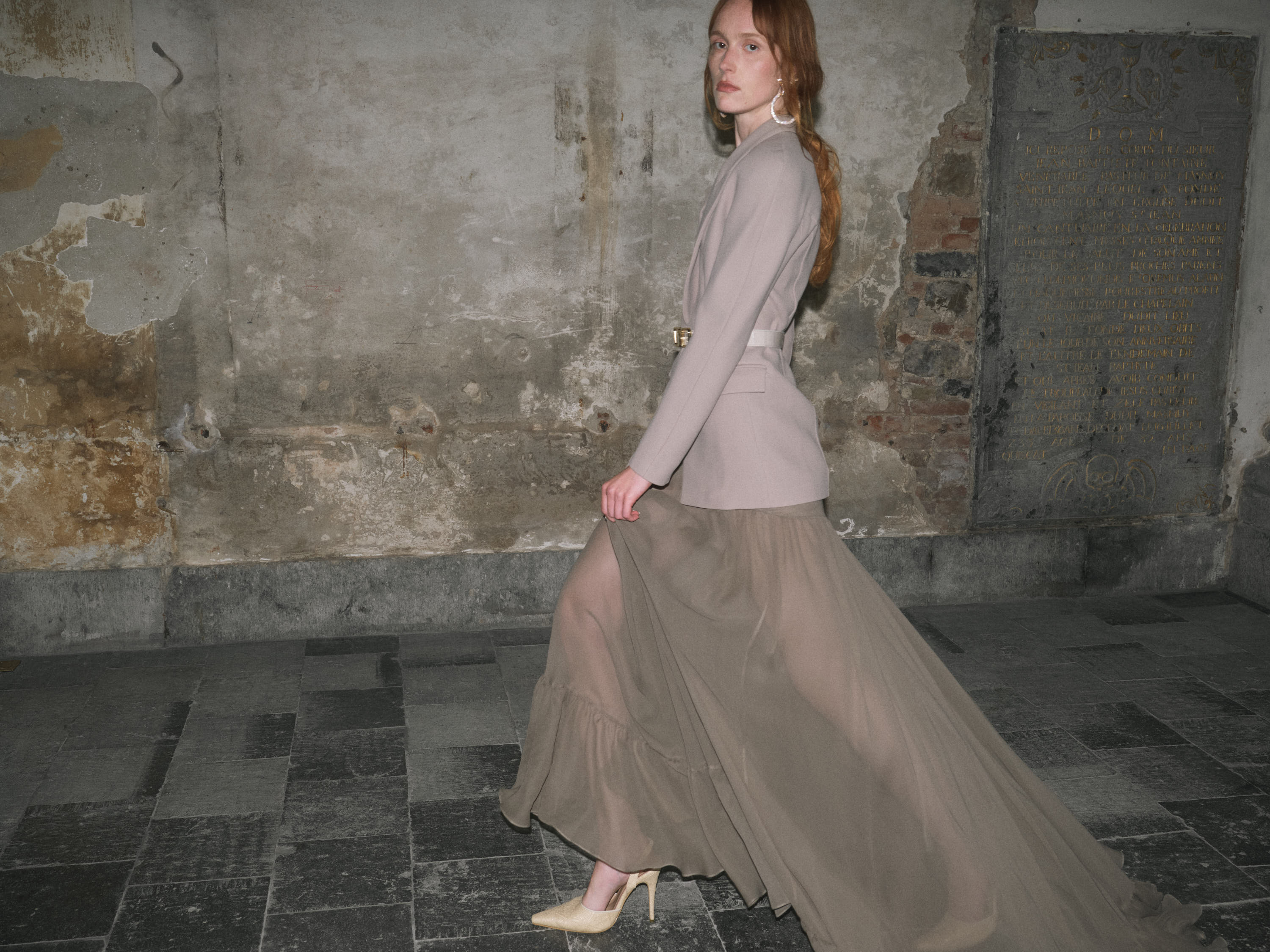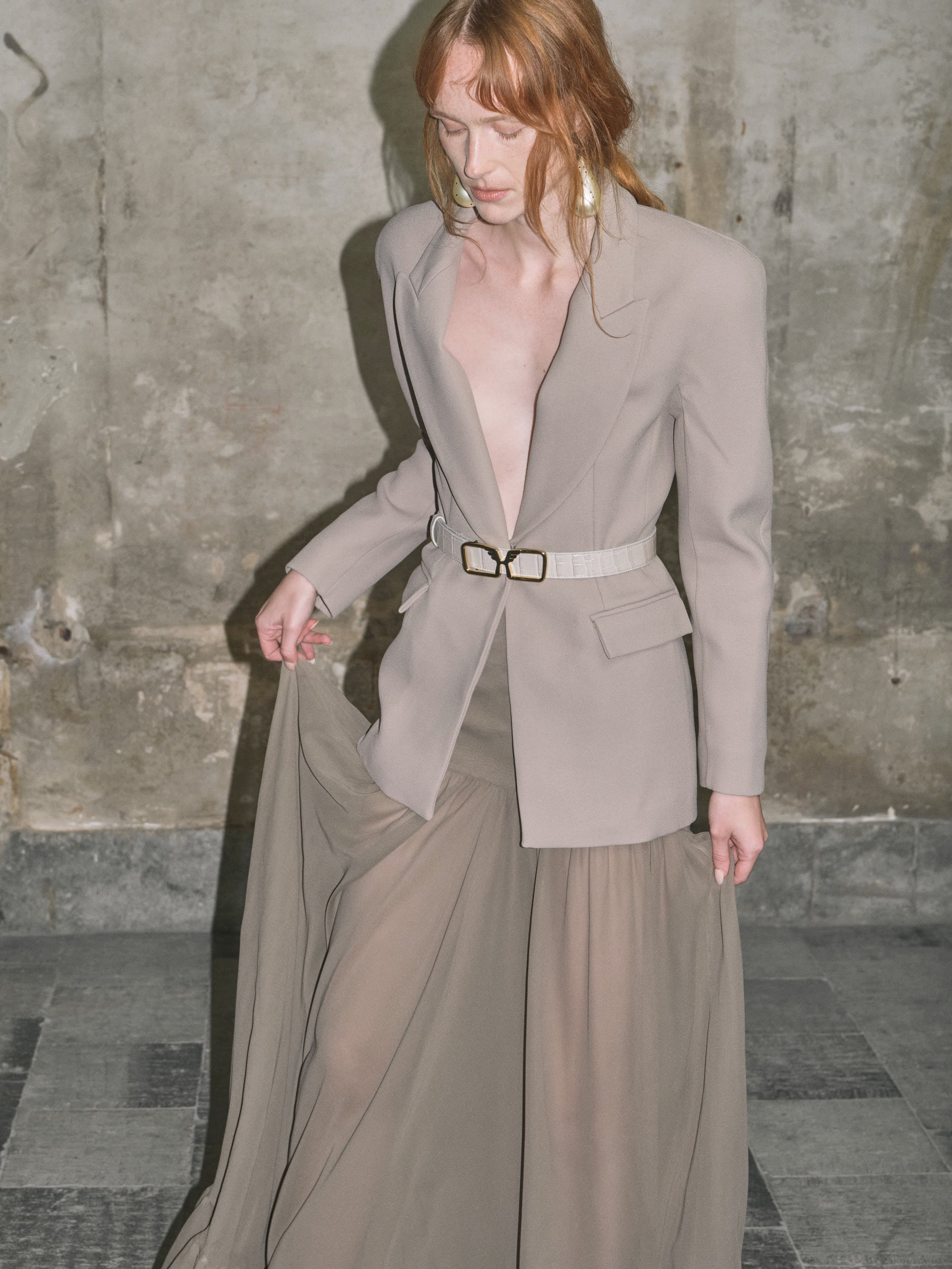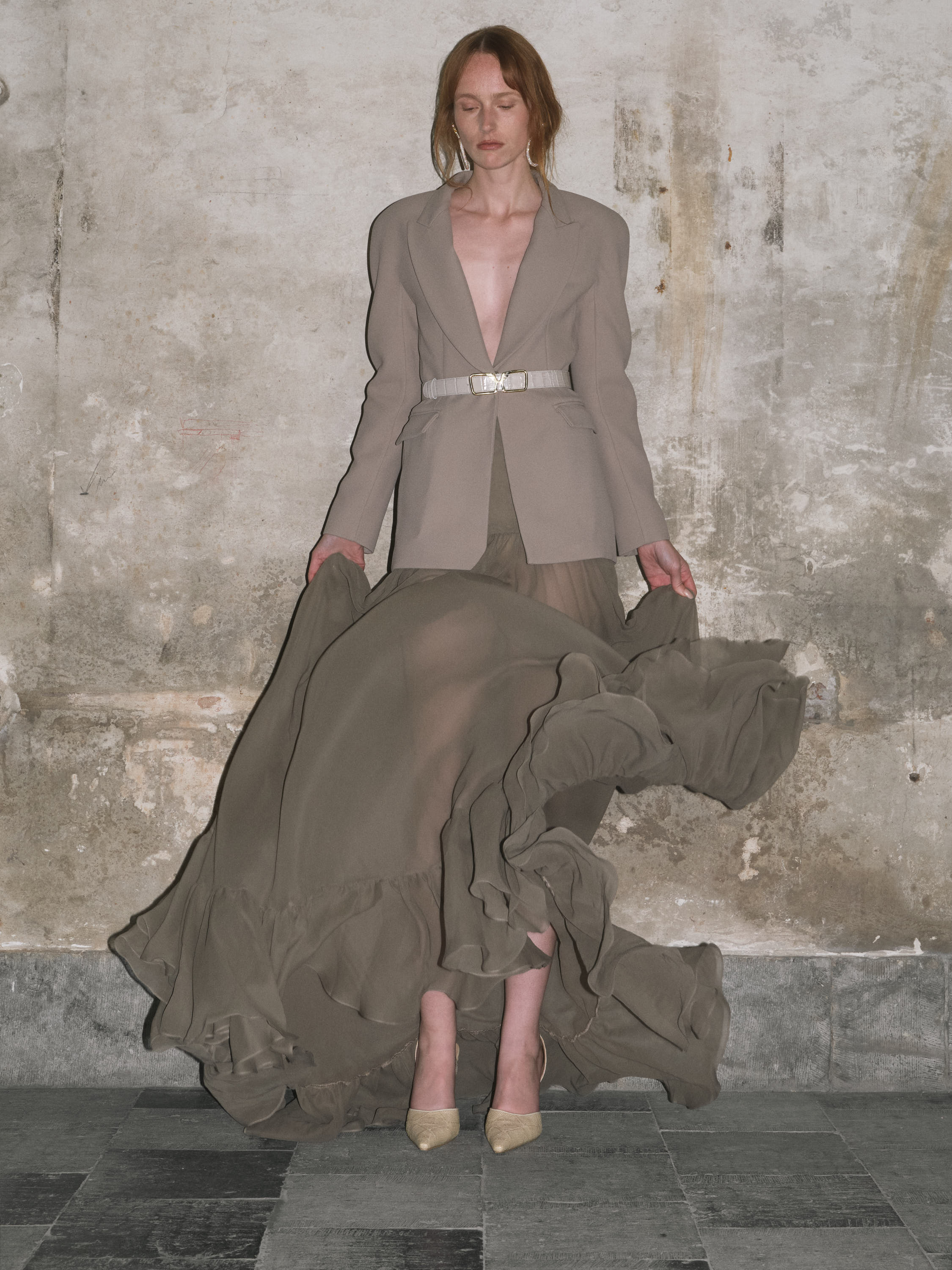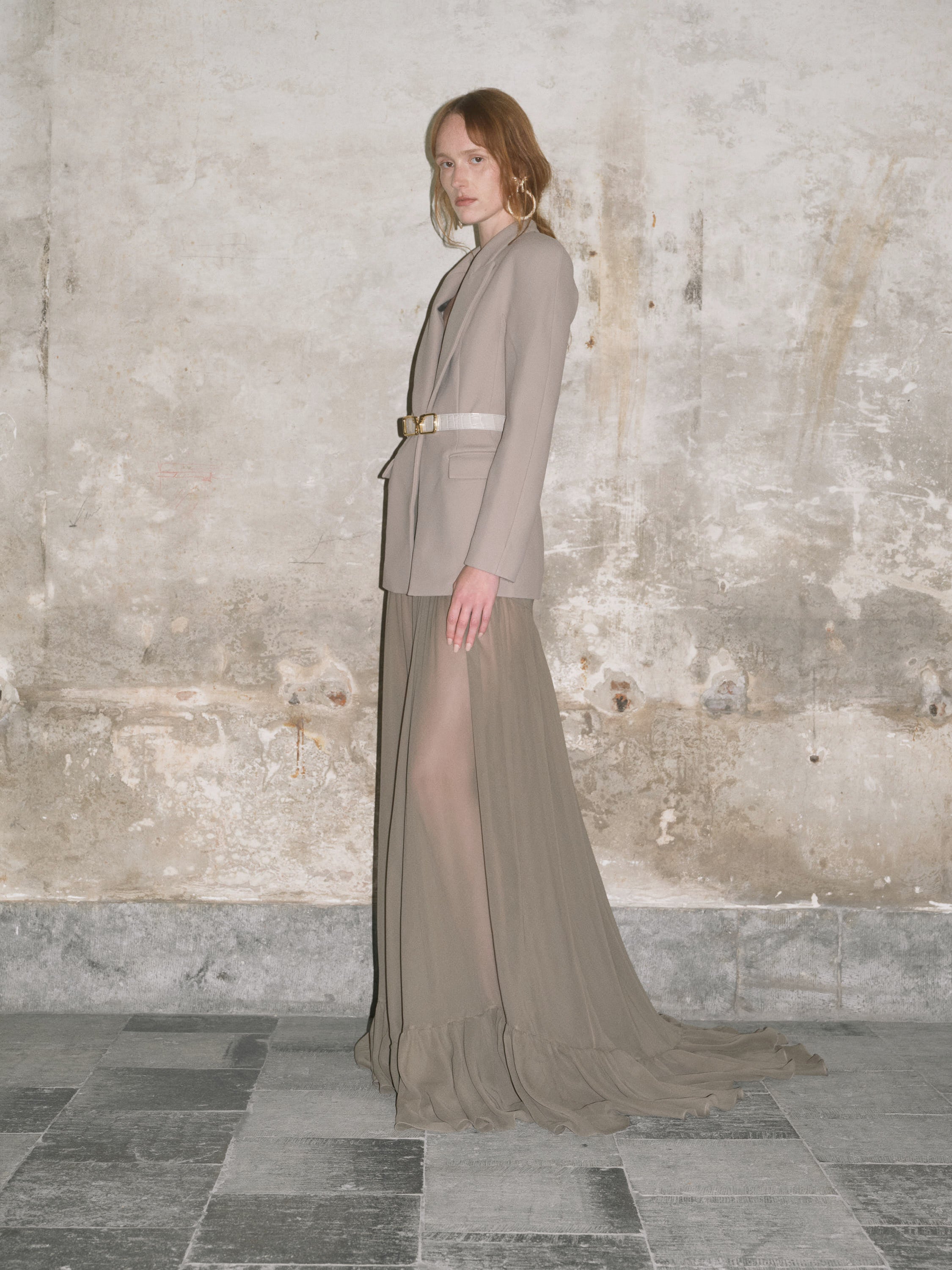 Regina straddles worlds with grace and strength, her presence drawn in the cut of a single-breasted blazer and the sweep of a floor-length skirt. The blazer, in double crepe, sharpens the silhouette with structured shoulders and a low-break peak lapel, fastening at the waist. Its counterpart, a silk georgette skirt, is gathered into tiers that fall to a flounce hem and train, tempering command with fluid movement.