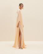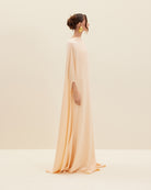 Harithand is a master of transforming cape dresses into exceptional eventwear. Draped from silk crepe, AMBER is a flowy maxi dress tailored with a front cape and cut low for a revealing back. The sides are finished with slits.
