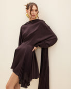 The BELLA dress is a mini style cut from fluid charmeuse in dark burgundy. The silhouette is designed with dolman sleeves and pleated detailing on the skirt. A signature built-in scarf frames the open back.