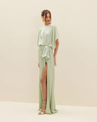 Cut and draped from sage green charmeuse, Cattleya is an elegant daywear offering. This maxi dress features a relaxed silhouette with fluttery sleeves and a long slit. The weightless fabric is gathered around the waist to create a knotted effect.