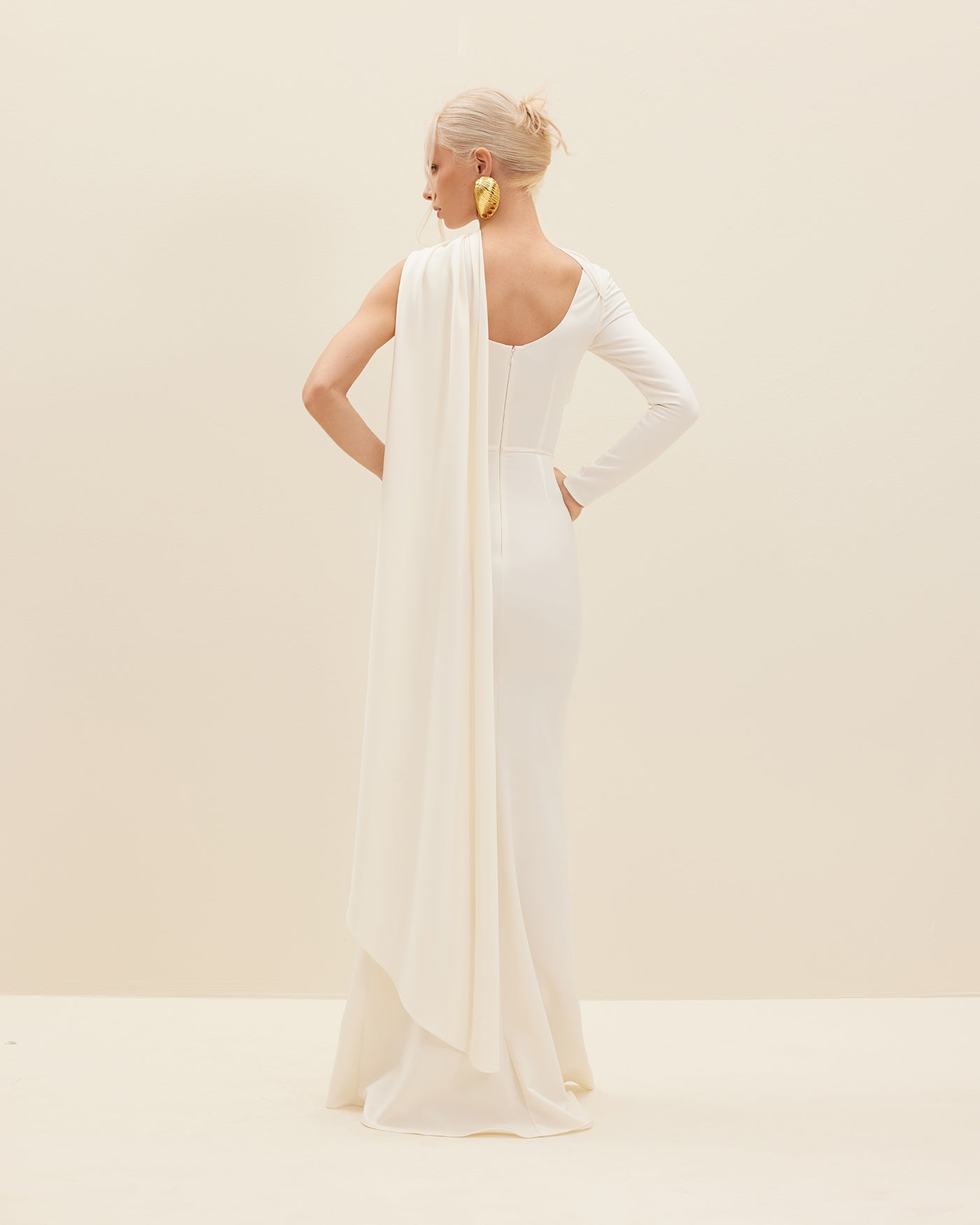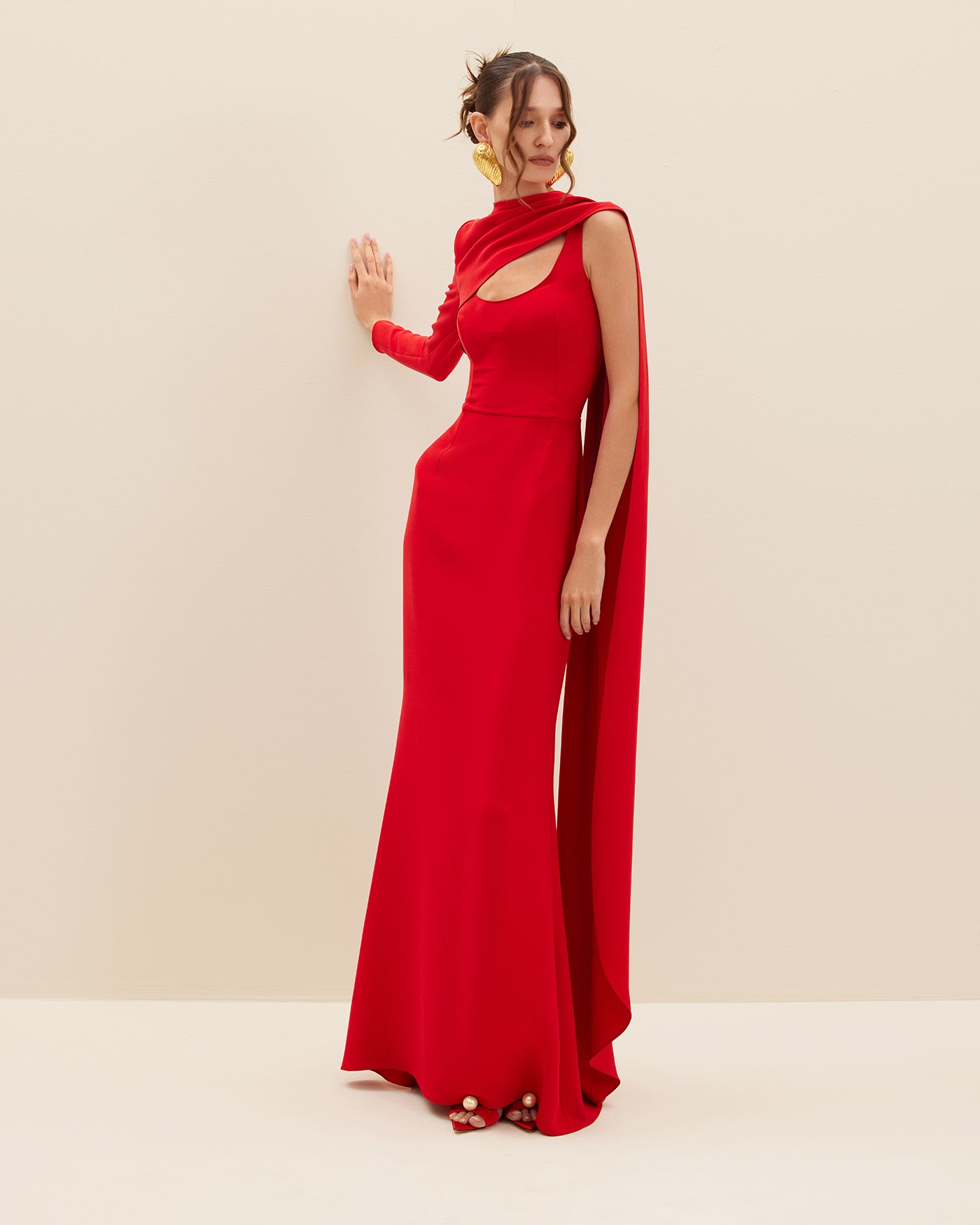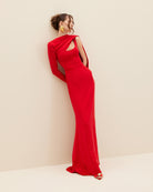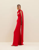 ISHTAR is made from red silk crepe marocain lycra for a flawless drape and fit. This column maxi dress has a full-length sleeve with an elongated scarf that winds across the shoulders and dips at the back.