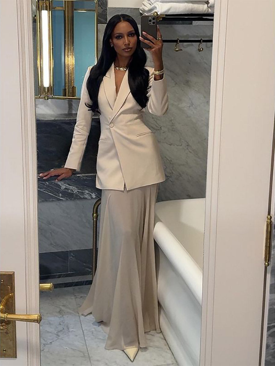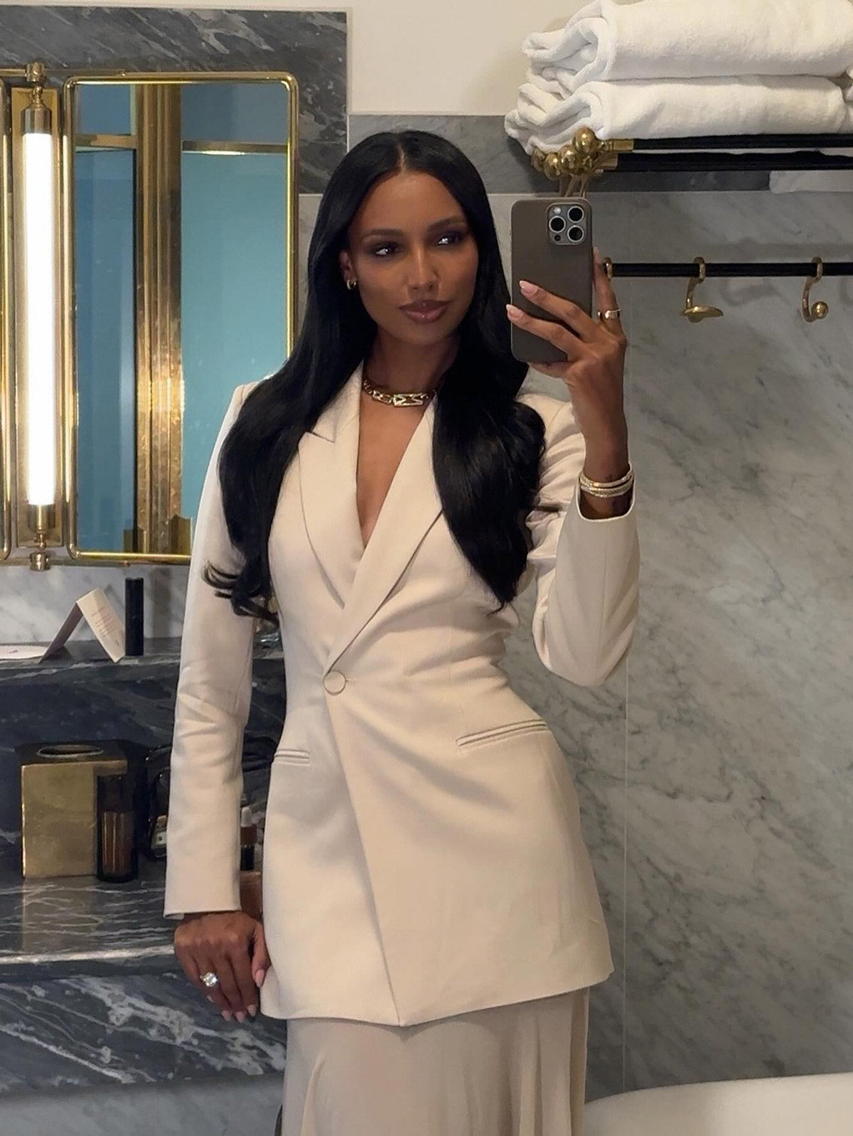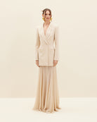 LATTÉ is a monochrome set topped by a gabardine blazer that's been padded on the shoulders and nipped at the waist. To streamline the look, the matching silk crepe georgette skirt is fitted around the hips before cascading to a flowy hem.