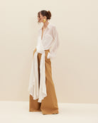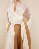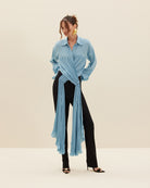 LUNA is a coordinating set showcasing a relaxed crepe de chine shirt with dipping lengths of plissé scarves. To complete the cross-over look, secure the shirt through the buttoned bands on the matching stretch gabardine slim-fit pants.