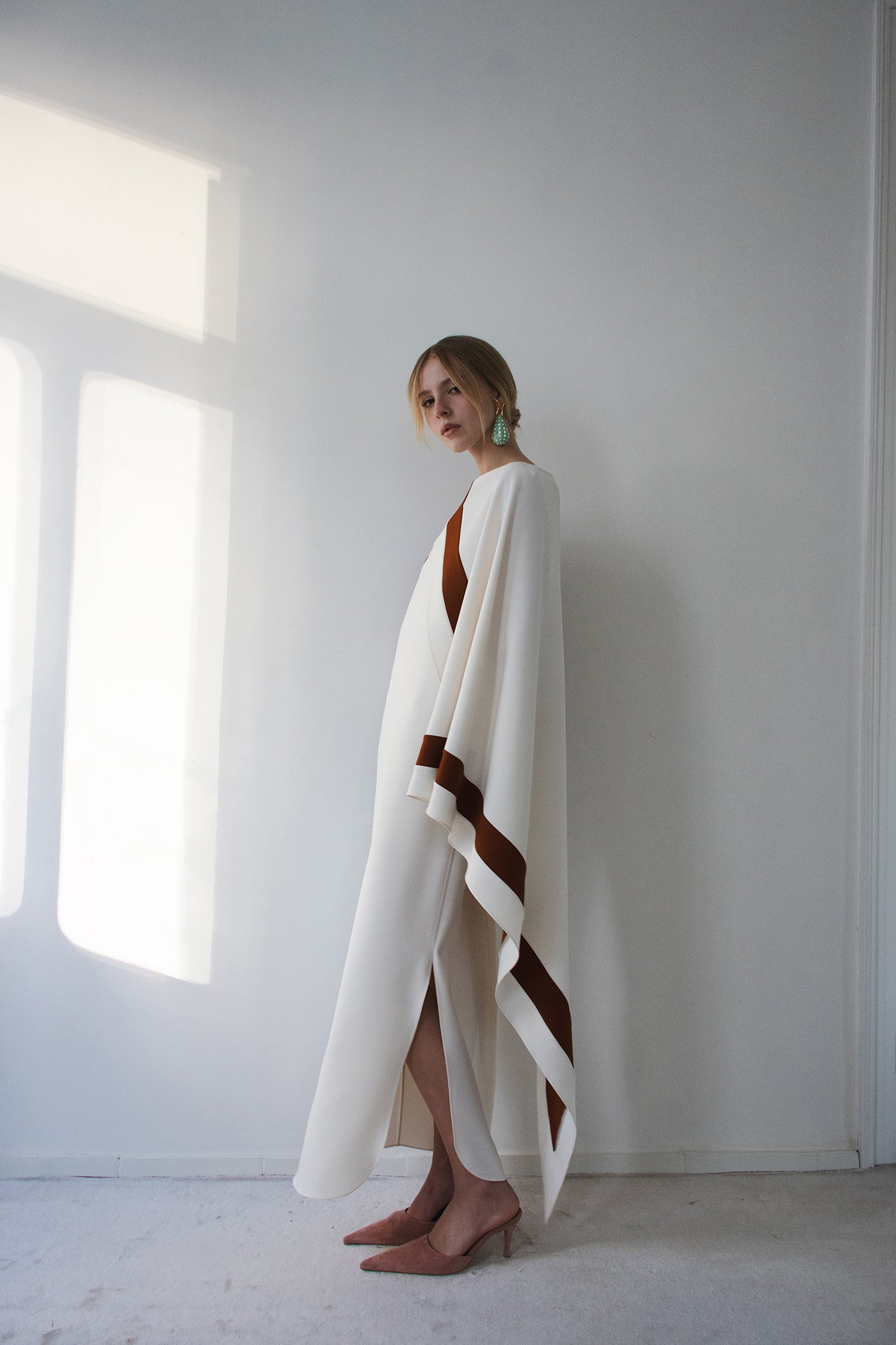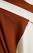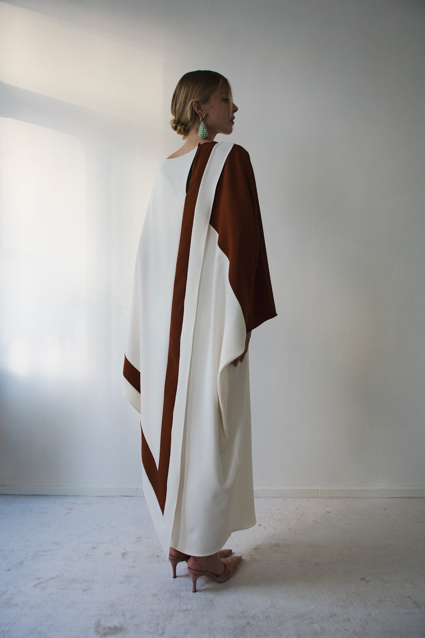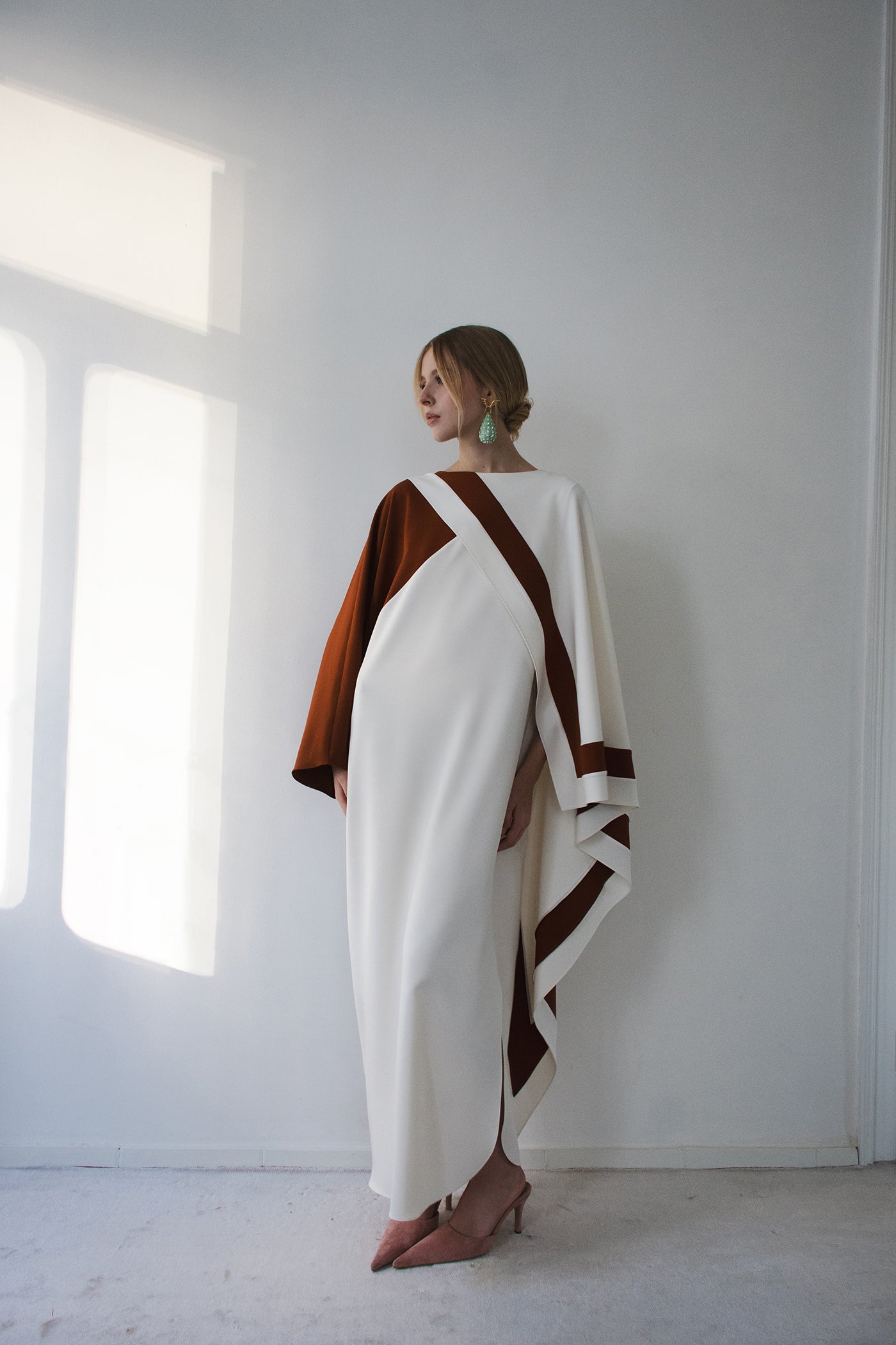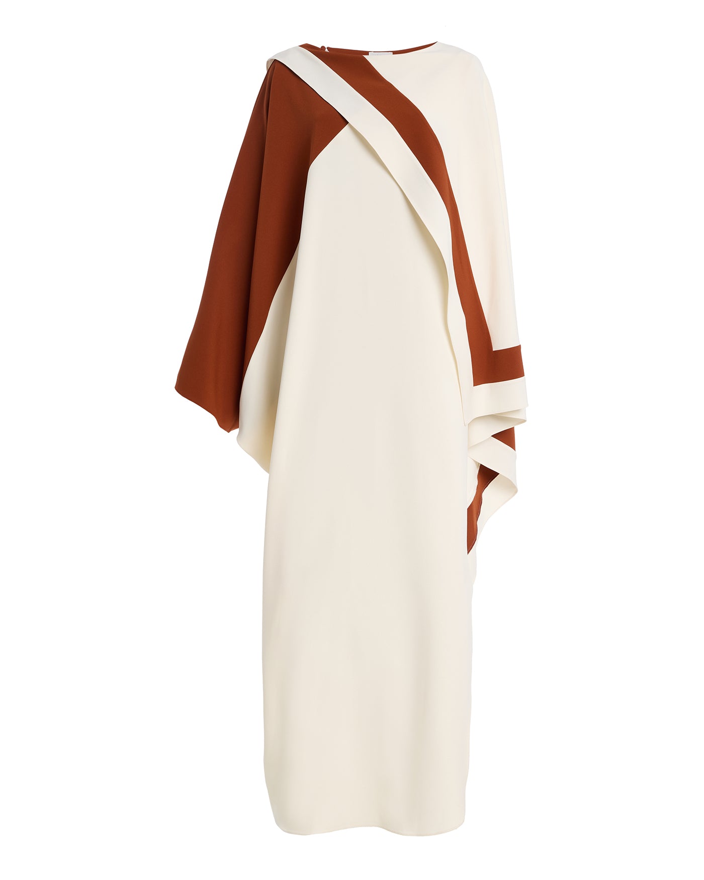 • Asymmetric color block design, cape sleeves, maxi hem