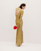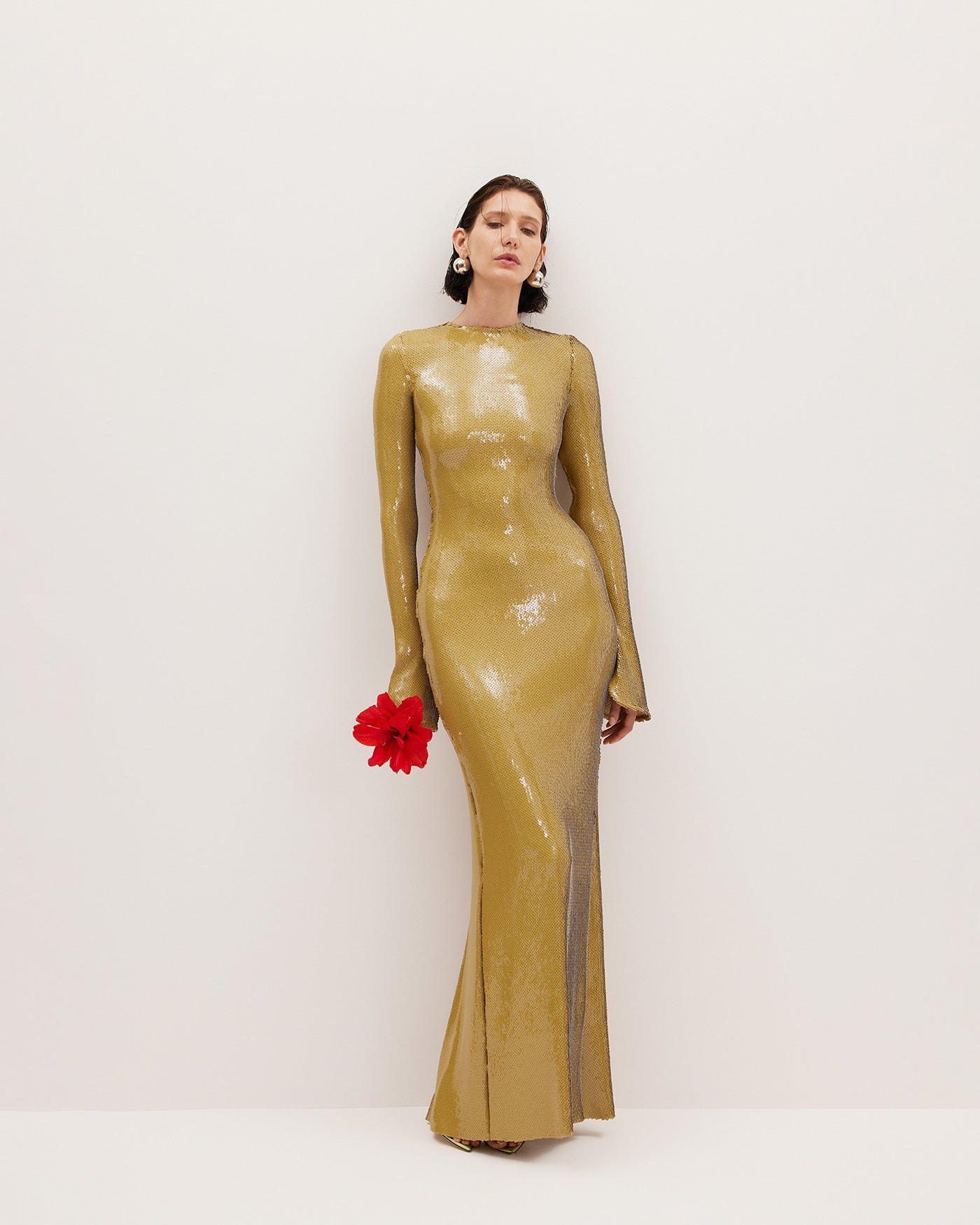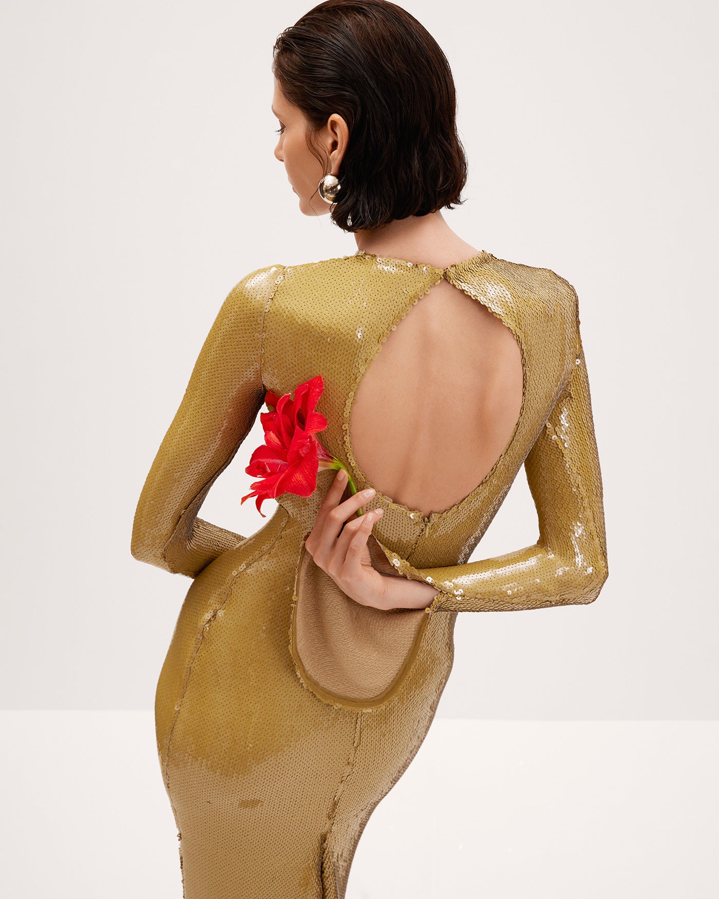 DIRTY MARTINI is a long dress drenched in olive-toned sequins, which lend a glistening, liquid effect upon catching light. The style is designed to hug the body and features the house's signature tear-shaped opening at the back.