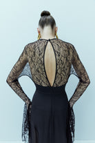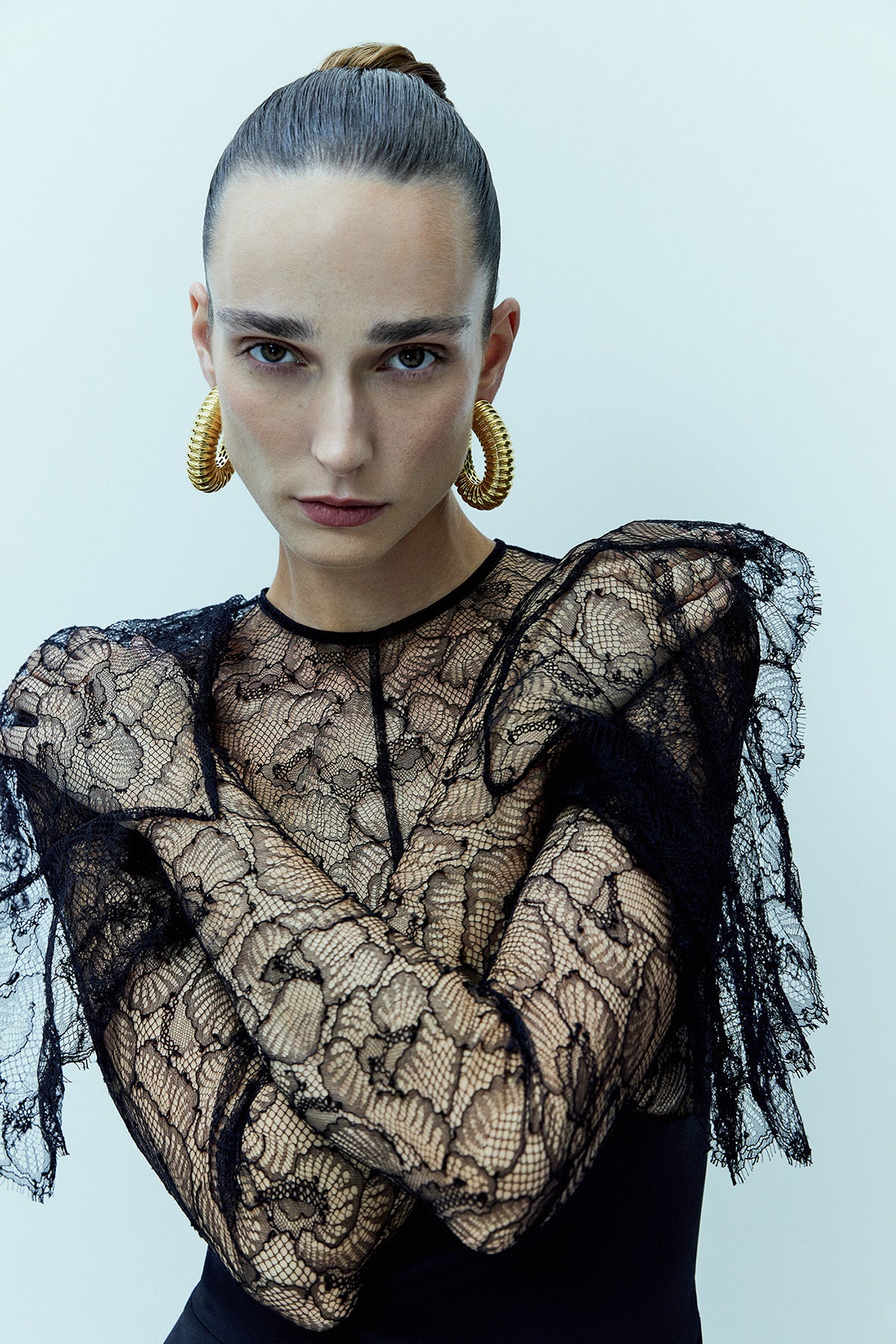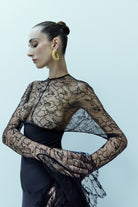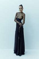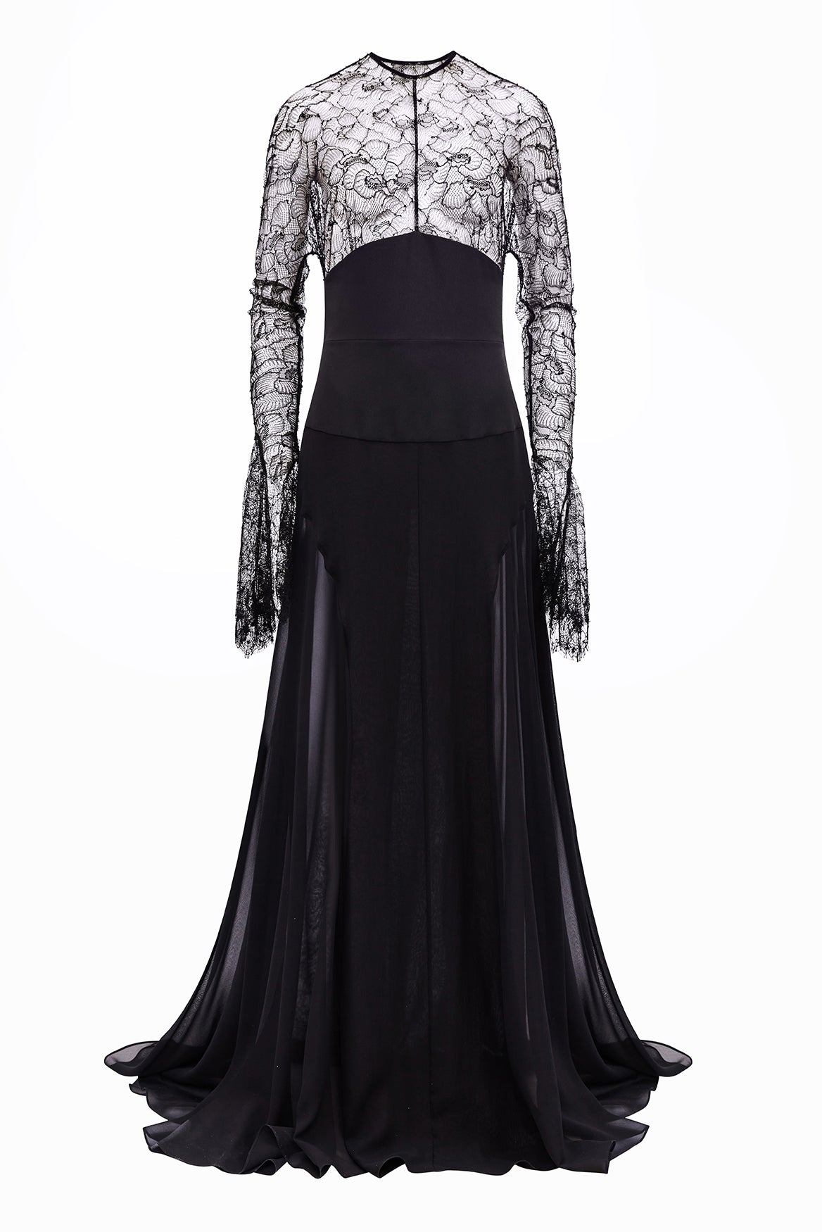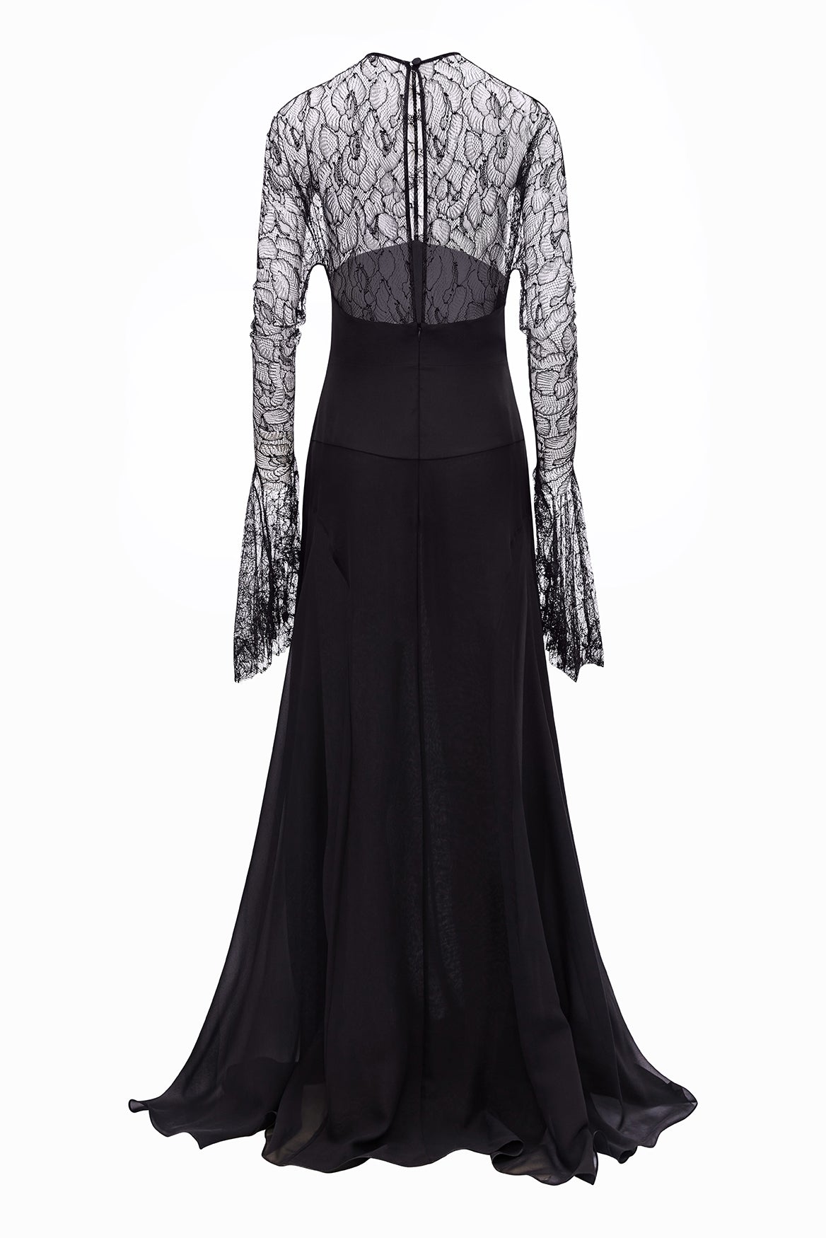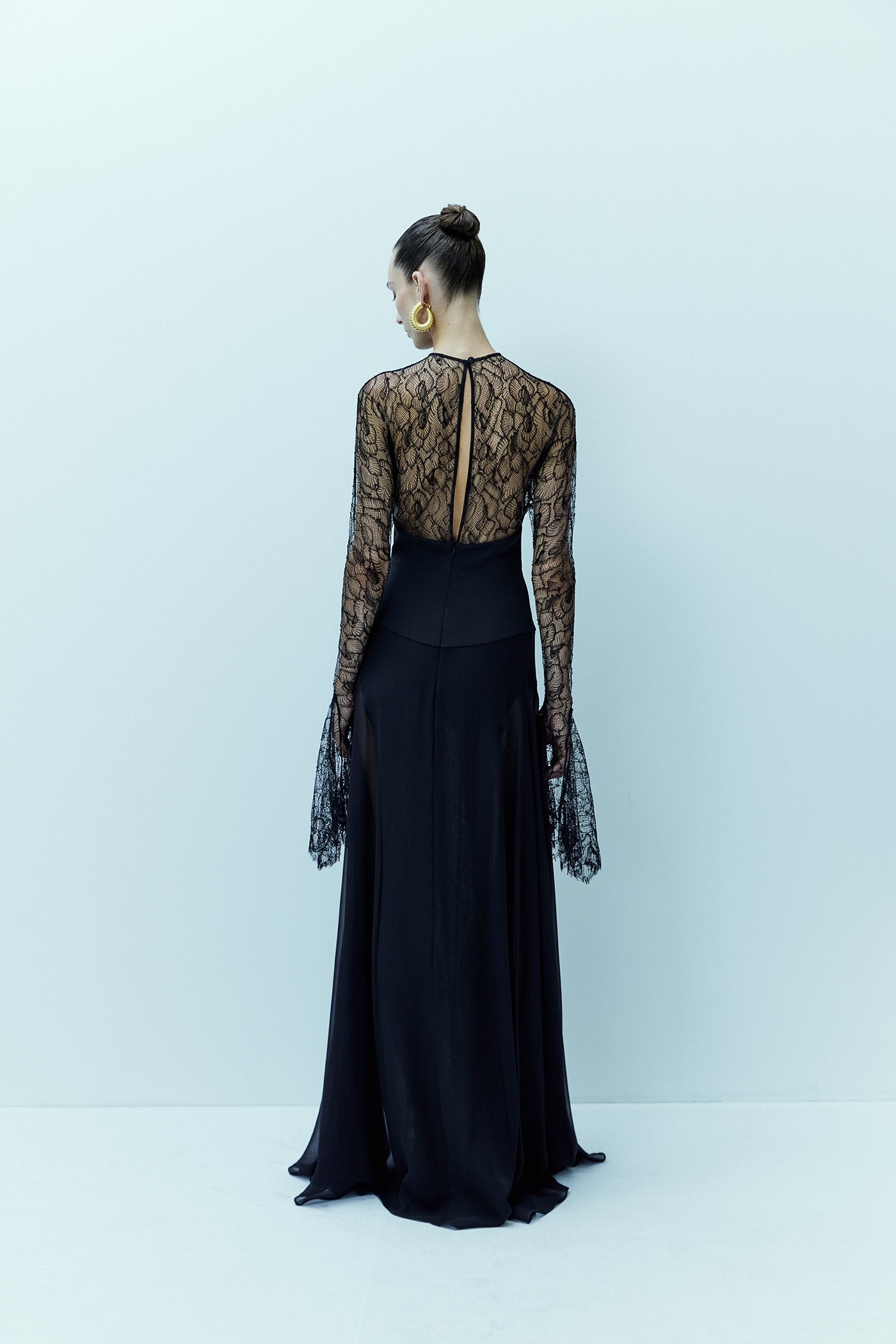 A black tie offering fit for the most exceptional occasion. L'AMOUR skillfully combines silk crêpe de chine, cut like a corset and seamed at the waist, with a relaxed silk georgette maxi skirt. The gown culminates in a bust of floral lace and features long sleeves with lengthy frills.