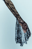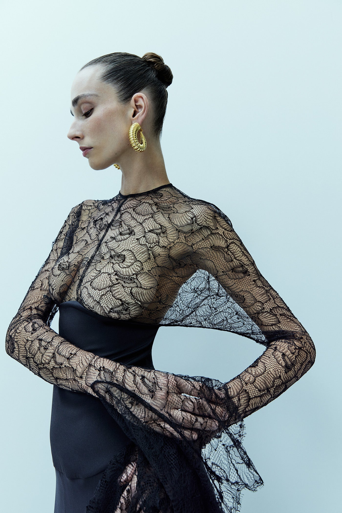 - Floral lace in black with silk crepe de chine and silk georgette.